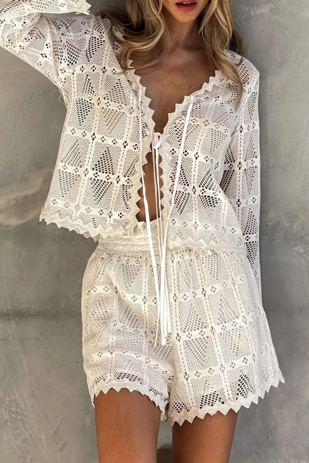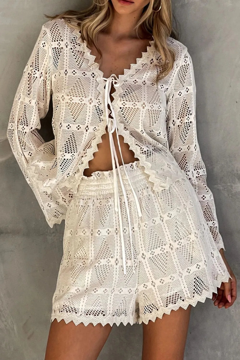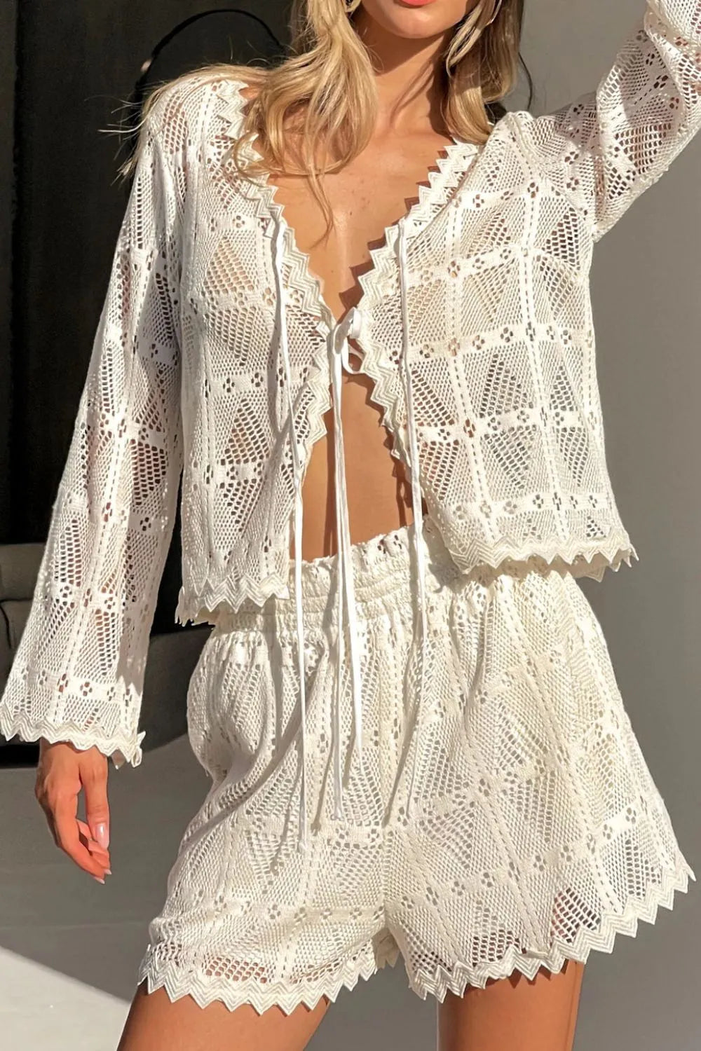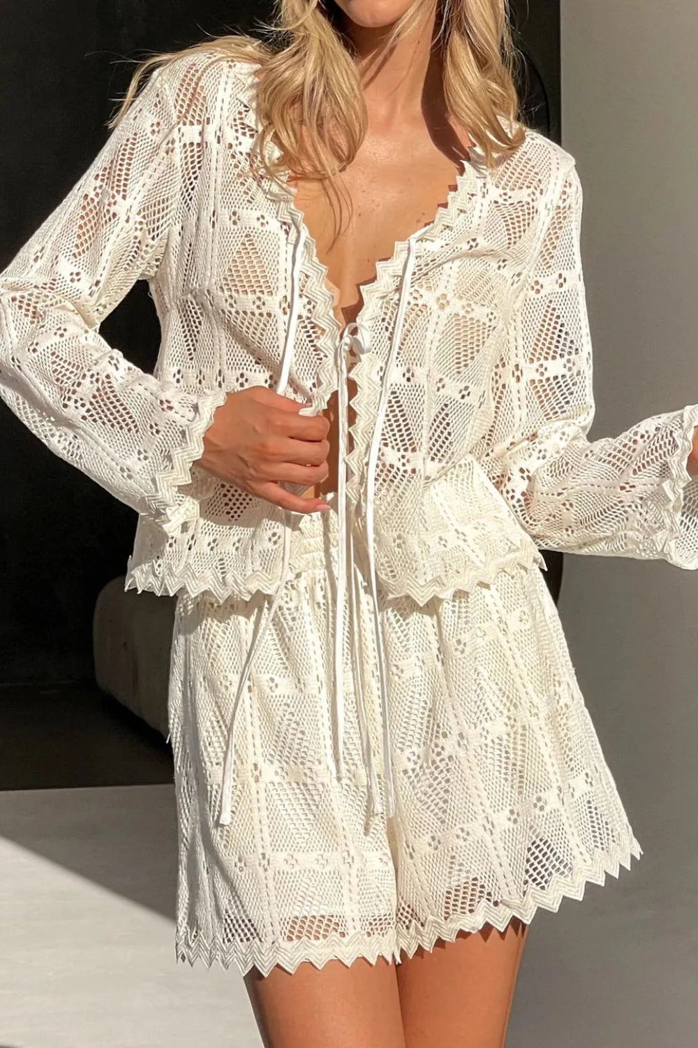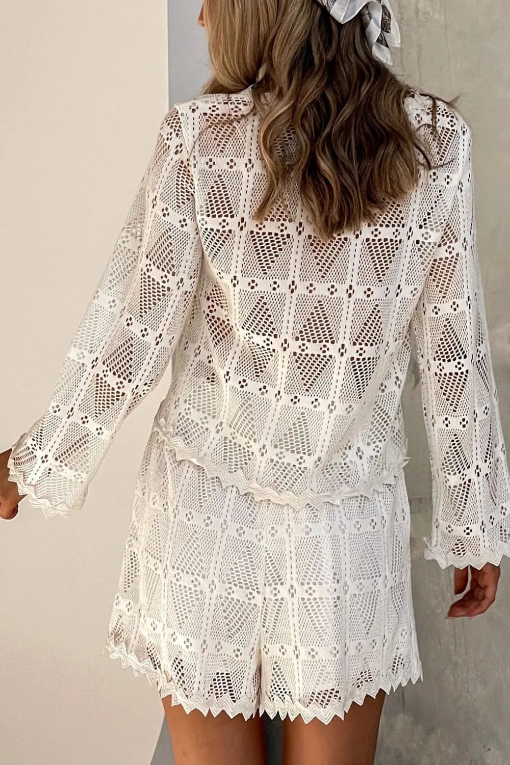 Crochet Lace Scalloped Hem Top and Shorts Two-Piece Sweater Set