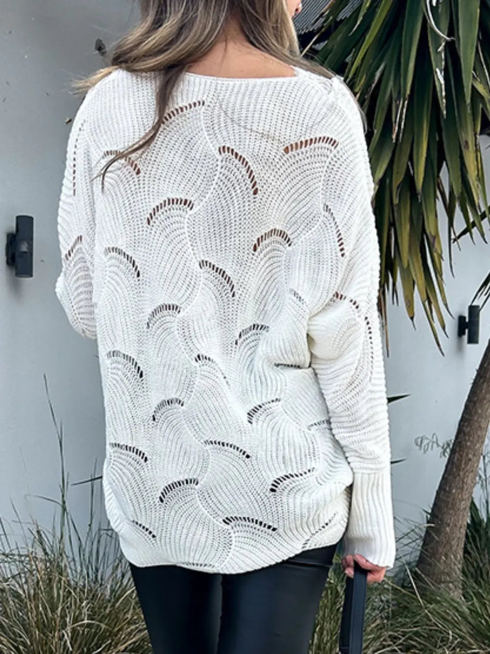 Perfee Lace Detail Openwork V-Neck Long Sleeve Sweater