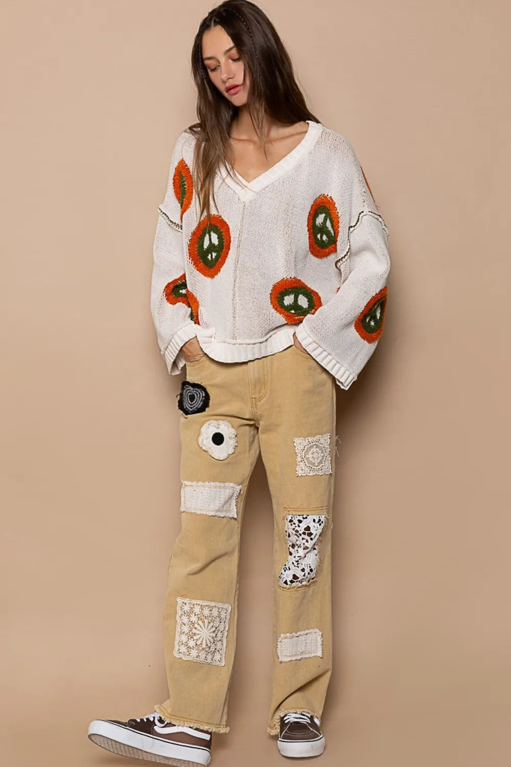 POL V Neck Long Sleeve Peace Pattern Sweater
