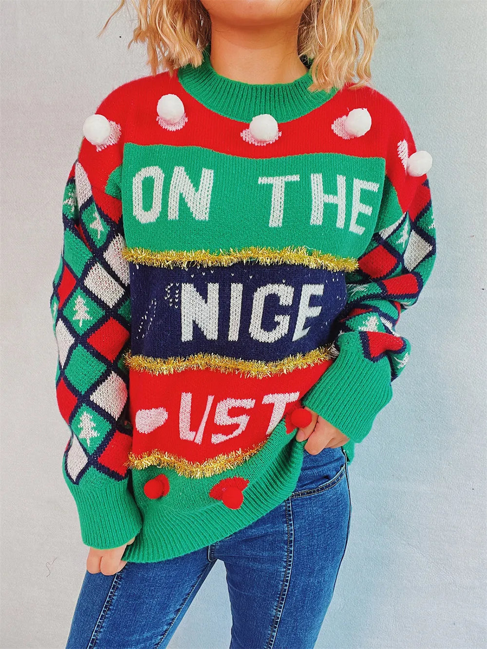 Pom-Pom Contrast Round Neck Long Sleeve Sweater