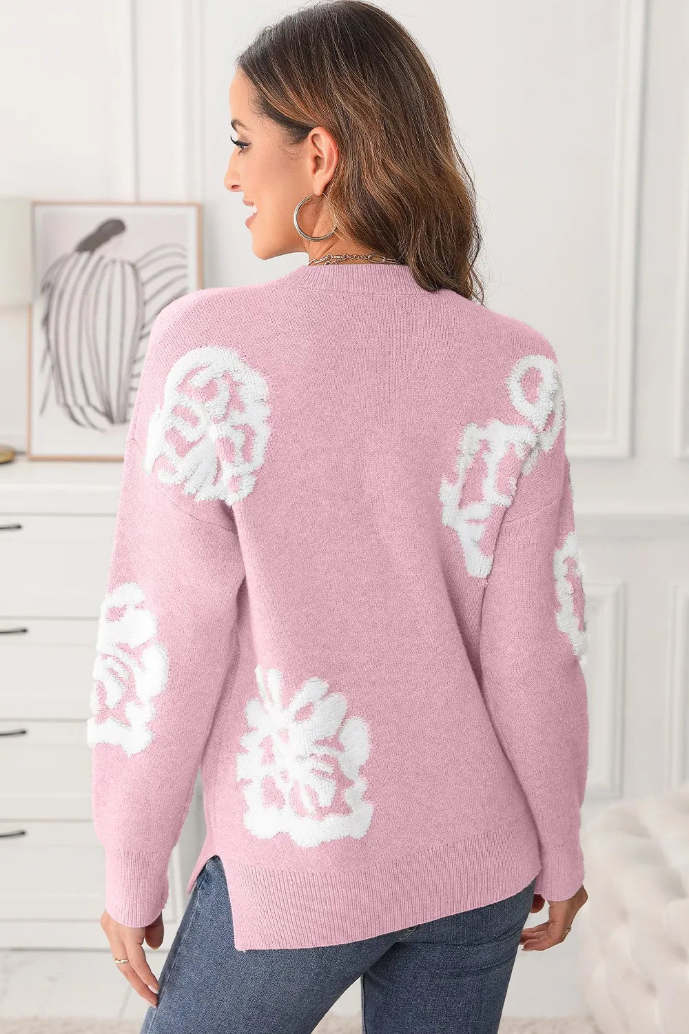 Slit Round Neck Dropped Shoulder Sweater