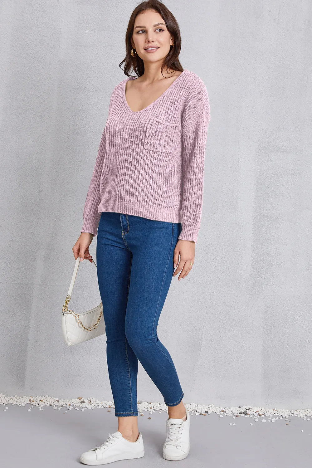 V-Neck Pocketed Dropped Shoulder Knit Top