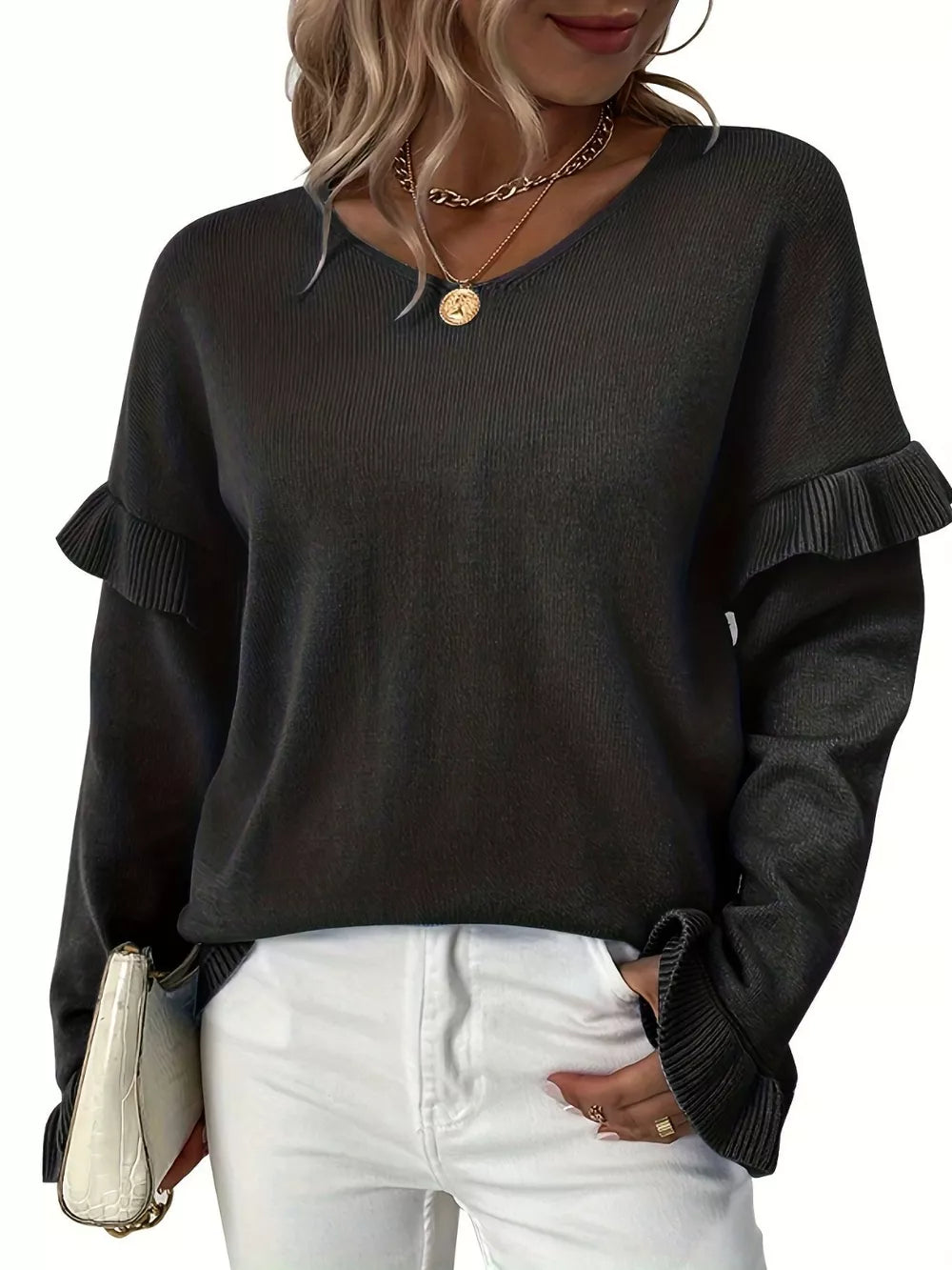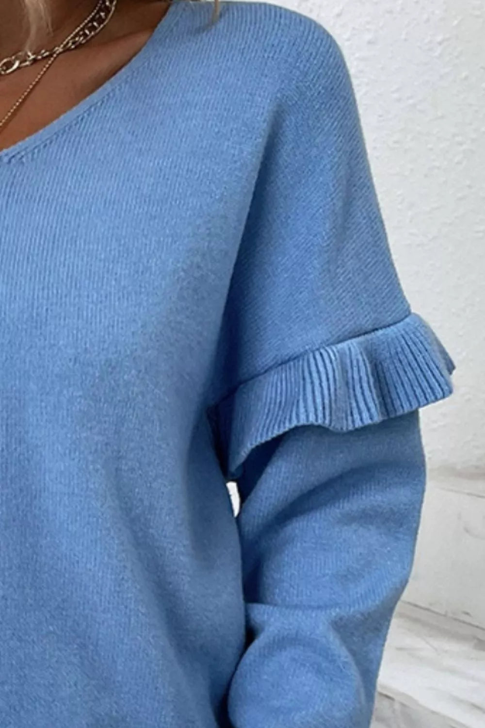 V-Neck Ruffle Trim Long Sleeve Sweater